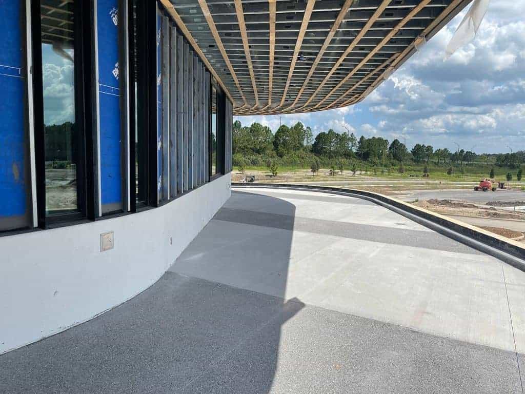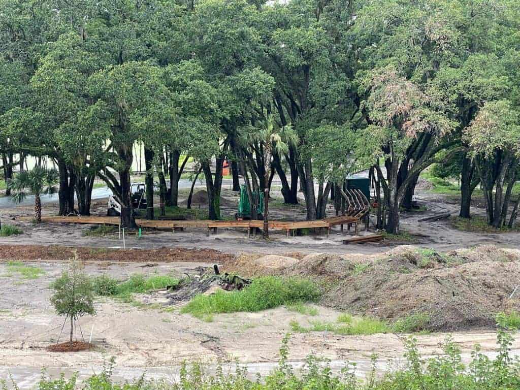 Moving north to the Florida Children’s Museum, each of the five exhibit spaces, offices, workrooms, and storerooms are identifiable as the interior framing continues. Electrical, plumbing, and HVAC trades are installing the ductwork and raceways that will be hidden within the walls. Next door, waterproofing the Café roof is a major focus. The significant challenge in the combined bridge-building is obtaining roofing materials. The nationwide shortage of roofing materials (and many other building materials) has presented quite the challenge for schedule and production. The view from Kathleen Road into the Park reveals the substantial change to the central areas of the Park. Hundreds of trees have been placed in the parking lots and along Bonnet Springs Boulevard. As this material is established, it is exciting to realize the growth potential and beauty that will change the landscape of one of Lakeland’s primary entries to the City.