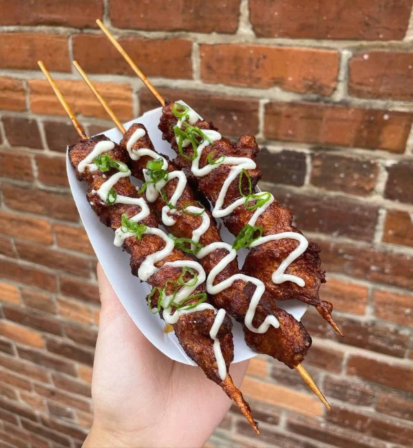 Pinoy rice combo, Pancit o Disco (vegan stir fry), Crab rangoons, Peek a Boo GF dough balls with filling, Turon (fried banana), Gyoza, Brussels, Chicken Skewers, Crispy Lumpia.