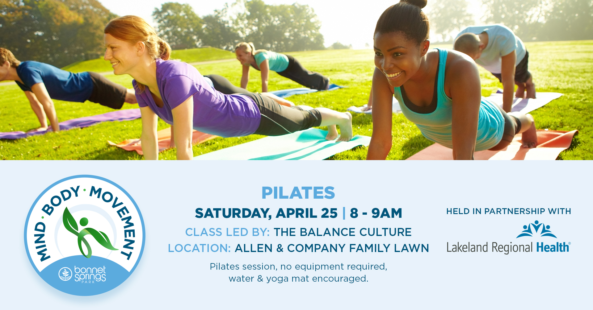 Improve your flexibility and functional movement with Pilates at Mind, Body, Movement on Saturday, April 25 from 8 – 9AM on the Allen & Company Lawn. Brought to you in partnership with Lakeland Regional Health, this low-impact Pilates class is led by the Balance Culture and is free to attend. All abilities, ages, and fitness levels are welcome, and bringing your own yoga mat or blanket and water is encouraged!